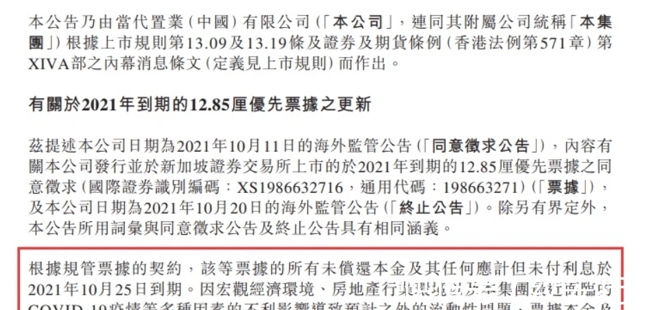 10月26日,当代置业发布公告称,一笔于2021年10月25日到期的美元票据违约。