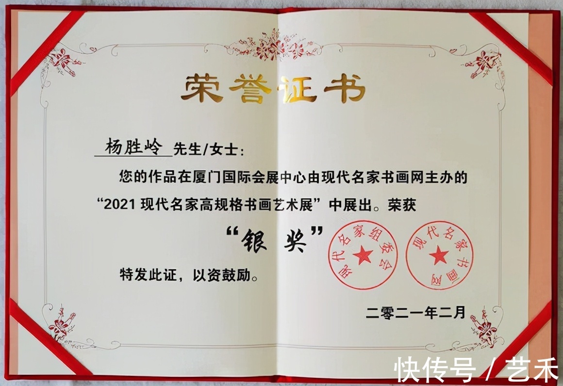 2021年2月杨胜岭先生作品再厦门国际会展中心由现代名家书画网主办的“2021现代名家高规格书画艺术展”中展出,荣获“银奖”。